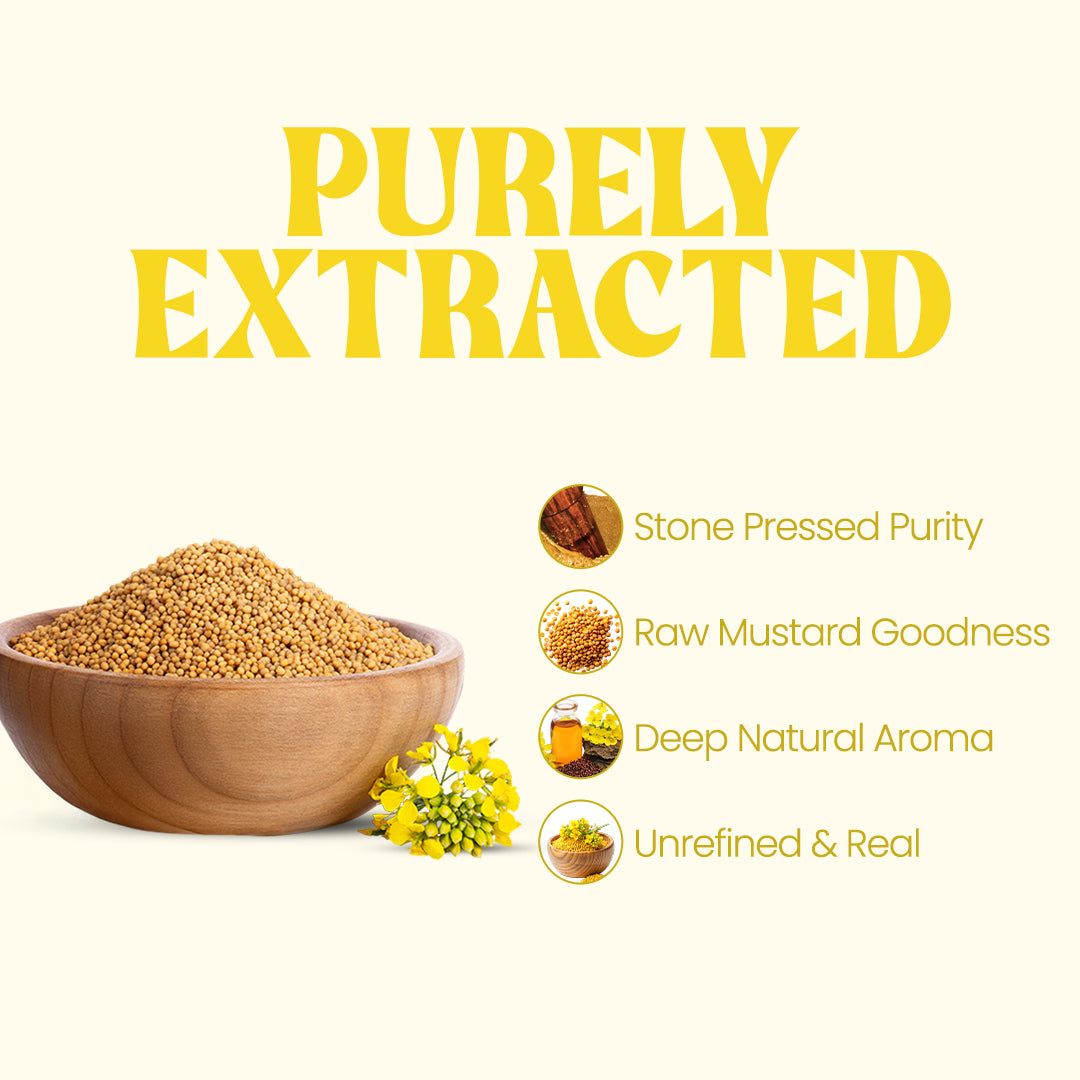 We use the traditional wood-press (kohlu) method to slowly extract oil from yellow mustard seeds at low temperatures. This chemical-free process preserves natural flavour, aroma, and nutrients, ensuring you get pure, wholesome oil for healthy everyday cooking.