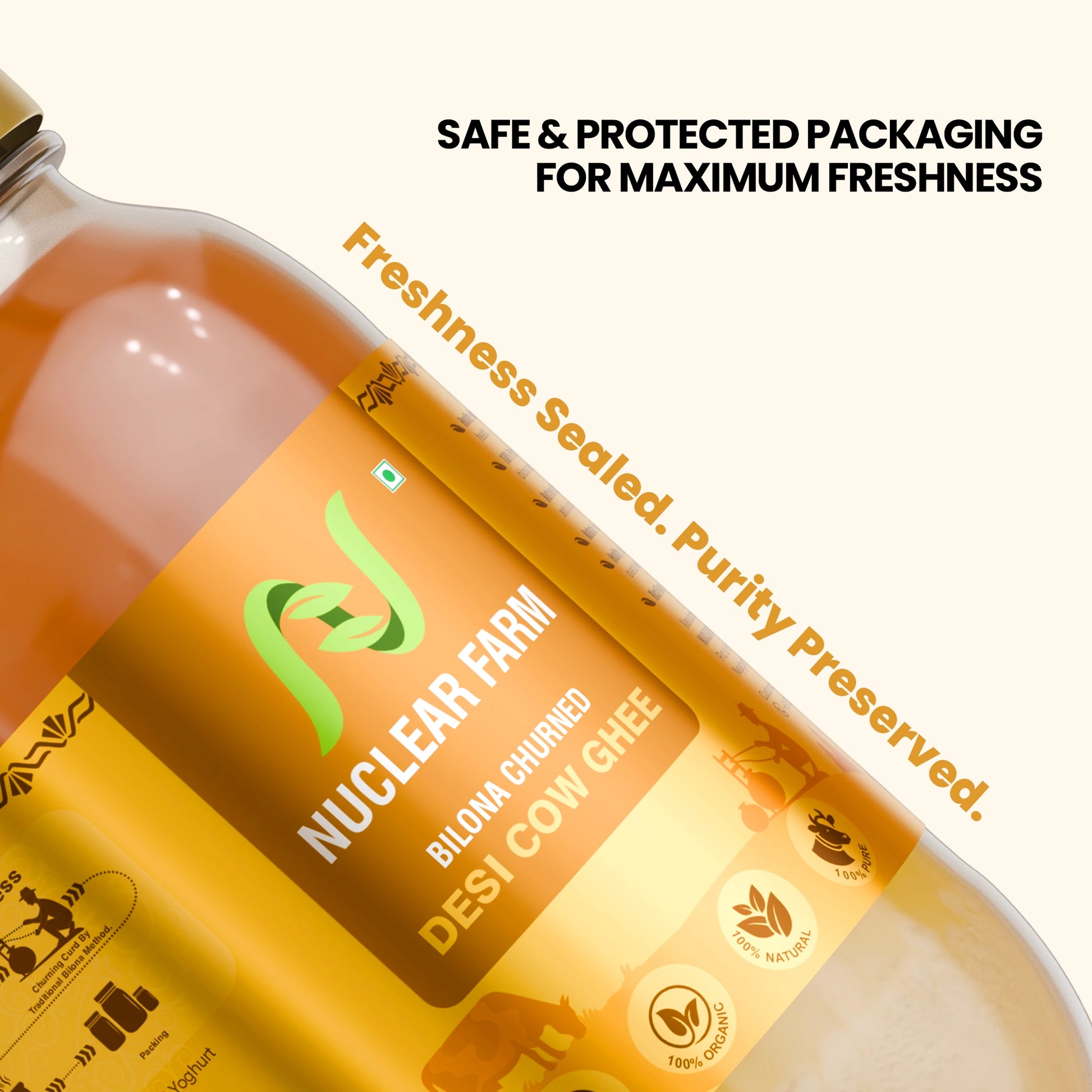 Desi Cow Ghee, made from A2 milk using the Bilona method, is loaded with healthy fats, vitamins, and antioxidants. It improves digestion, strengthens immunity, supports joint health, and enhances nutrient absorption, all while adding authentic richness to food.